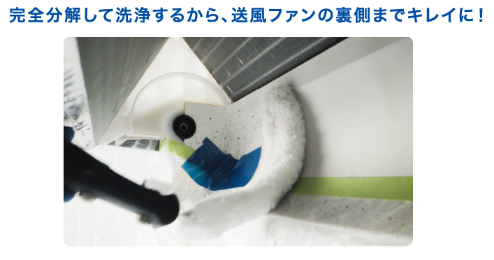 ドレンパン・送風ファンまで外すことで、通常のエアコンクリーニングでは届かなかった送風ファン部分の裏側や、隠れた汚れまで逃さず徹底して洗浄できます!