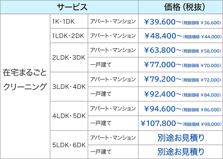 デザイナーズマンション・メゾネットタイプ・通常㎡数を大幅に超える住宅の場合、左記価格では対応できません。別途お見積りさせていただきます。